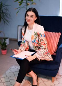 Psycholożka o specjalności klinicznej z przygotowaniem pedagogicznym, certyfikowana trenerka TUS (Treningu Umiejętności Społecznych), ukończyła studia podyplomowe z terapii rodzin oraz jest w trakcie studiów z psychologii sądowej. Na co dzień pracuje z dziećmi (